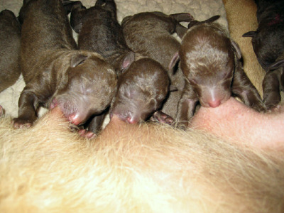 Am dritten Tag ist die Milchbar gut gefüllt und von 24 Stunden sind die Welpen 23 mit Trinken beschäftigt. Quiekende, schmatzende und unbeschreibliche Laute erfüllen unser Küchenkino. Dazu noch der Welpengeruch, von dem einst der kleine Luka sagte: "können wir wieder zu der Frau Meppen in die Küche gehen, dort duftet es so herrlich nach Welpen".